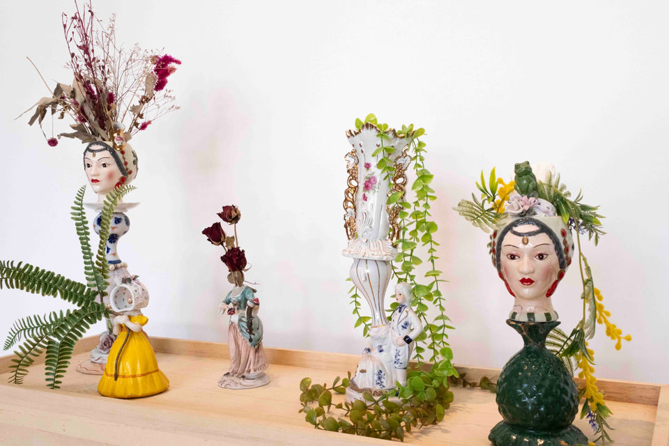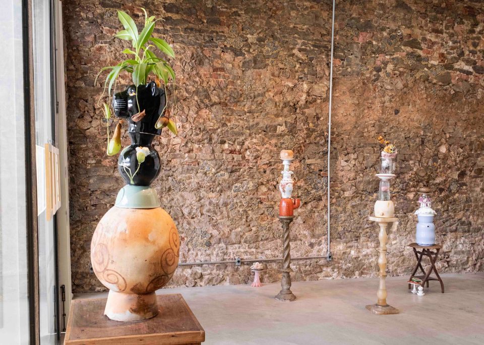 Se hibridizando com a coletânea de peças reunidas por Ambrósio, espécies de plantas e flores encontram morada nas esculturas em xícaras, cuias, molheiras e potes, agora ressignificados para esta função. A artista elabora nessas esculturas a partir de três formações: plantas vivas, plantas secas e plantas artificiais.